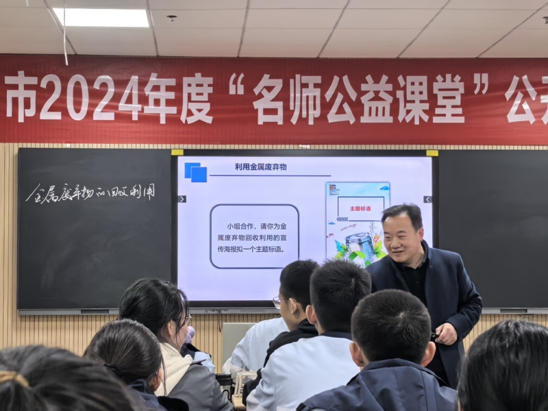 第二节课由徐作培老师执教《跨学科实践:金属的回收利用》。徐老师重点关注金属制品的应用与回收这一资源有效利用的社会热点议题,从金属废弃物的概念界定、物质组成和金属元素鉴别,金属废弃物的流向和再利用技术介绍等方面,充分调动学生的已有认知和学习积极性,用DeepSeek作为辅助工具,引导学生全面、系统、深刻的认识社会问题,在学习过程中自觉体验化学学科的社会价值,形成学科自觉。
