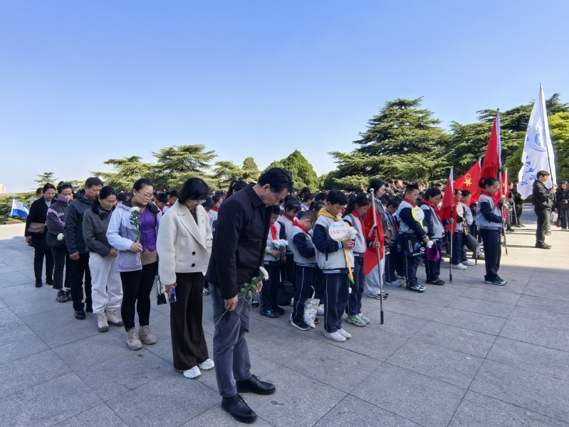 紧接着,全体师生默哀。这一刻,时间仿佛凝固,现场只有微风拂过松柏的沙沙声,寄托着大家对革命先烈的深切哀悼。默哀毕,师生们手持亲手制作的小白花,绕塔一周,将白花轻轻放在塔基旁。每一朵白花,都代表着一份对先烈的敬仰与追思;每一次鞠躬,都表达了对革命精神的传承与弘扬。