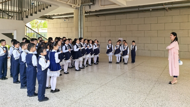 比赛即将开始,报告厅外飘荡着稚嫩的音阶练习声,孩子们在班主任老师的带领下排着整齐的队伍,“小花要向着太阳仰头哦!”老师耐心地叮嘱着每一个孩子,并帮他们调整着向日葵花饰的角度。“老师,今天怎么这么多人,好紧张呀。”领唱同学一边戴着耳麦一边反复地念叨着……每一个班级都是秩序井然、有条不紊。