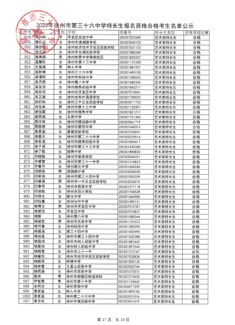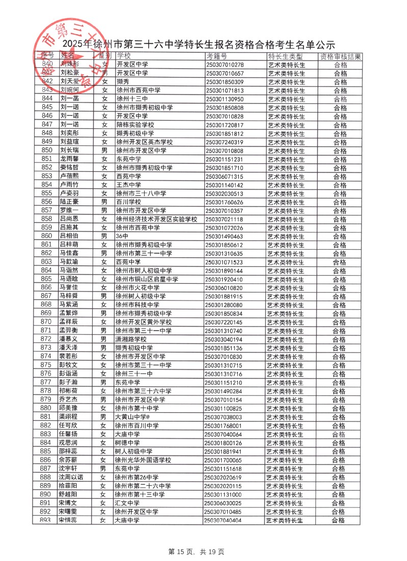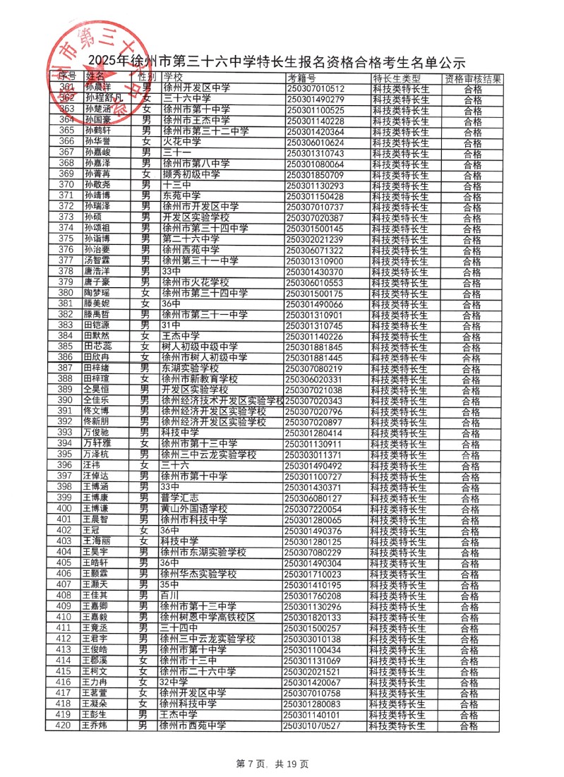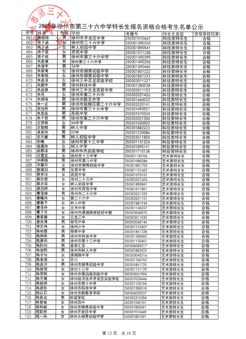 徐州市第三十六中学2025年科技和艺术特长生资格审核公告