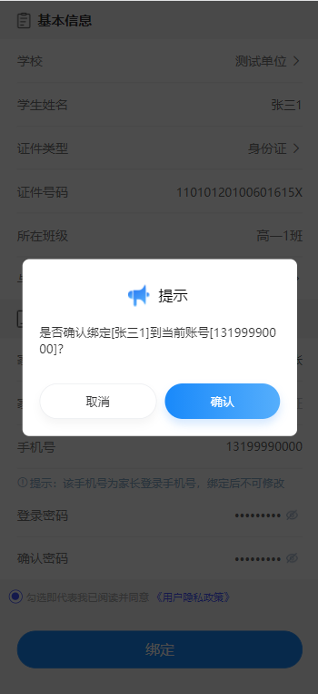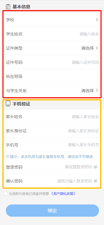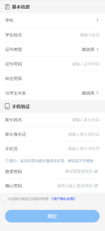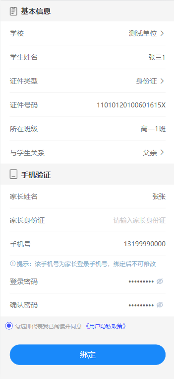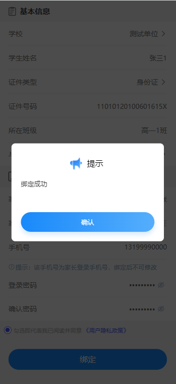 填写完所有必填信息后,勾选用户隐私政策,点击绑定按钮,完成绑定。
