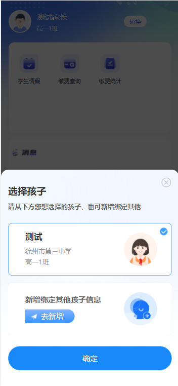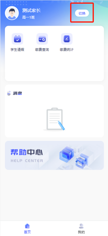 同一家长需要绑定多个学生,点击右上角【切换】按钮,可以新增绑定和切换学生。