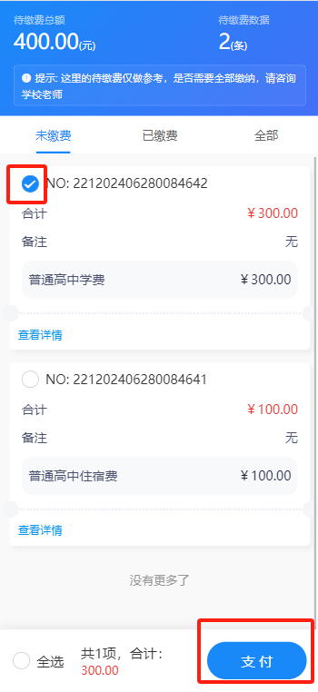 选择要缴费的项目,点击支付开始缴费。