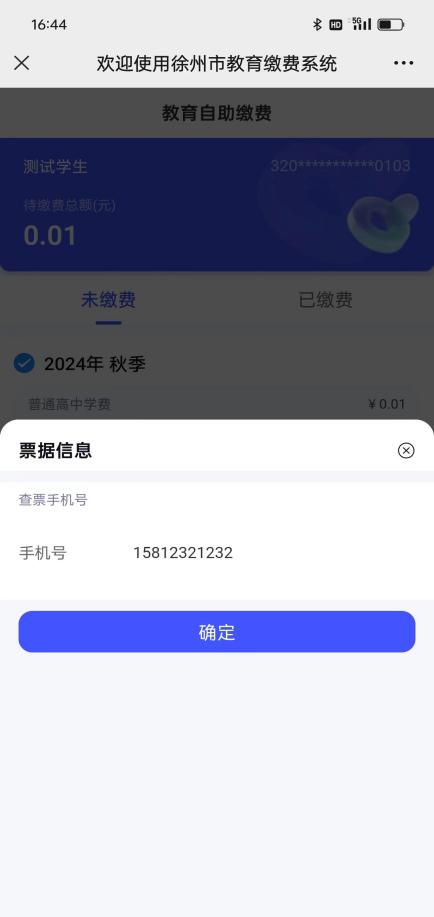 点击支付后,弹出票据信息,需要检查是否为获取电子发票的手机号,如不是请修改。修改后点击确定可继续支付。