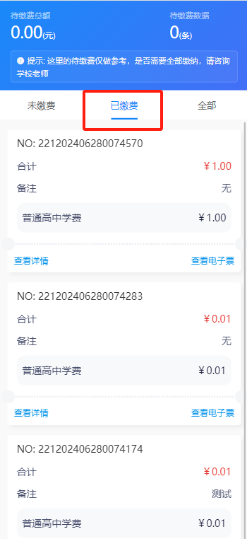 点击缴费页面中【已缴费】菜单,可查询所有的历史缴费记录。