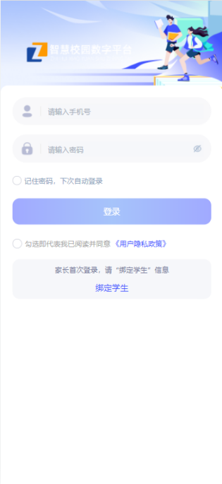 首次使用系统的家长,需要先绑定学生信息,点击页面中间位置的【绑定学生】按钮,填写学生信息和家长信息来绑定学生。