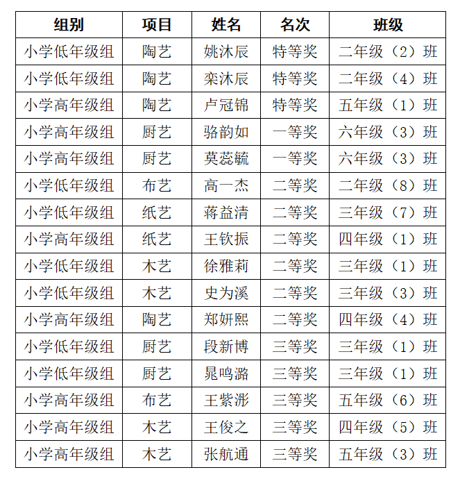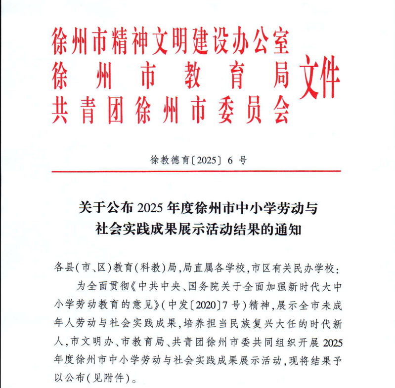我校从2025年12月30日的《关于公布2025年度徐州市中小学劳动与社会实践成果展示活动结果的通知》文件中获悉,徐州市第三十六中学学子凭借扎实的实践能力、创新的实践成果与良好的综合素养,在众多参赛选手中脱颖而出,斩获佳绩!在陶艺、厨艺、布艺、纸艺、木艺项目中共计获奖16人次,其中特等奖3人、一等奖2人、二等奖6人、三等奖5人。特向各位师生、家长以及关心和支持学校发展的各界人士报喜!