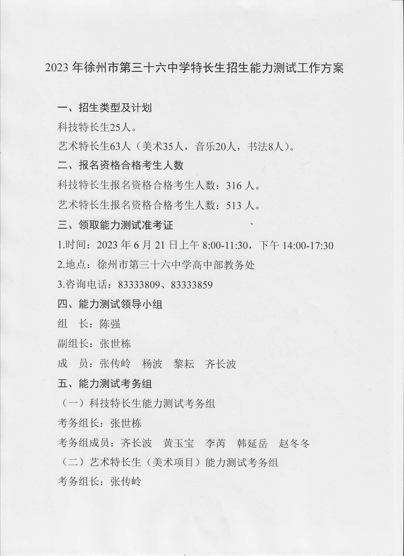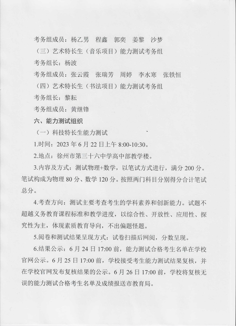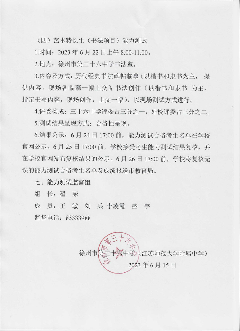 2023年徐州市第三十六中学特长生招生能力测试工作方案
