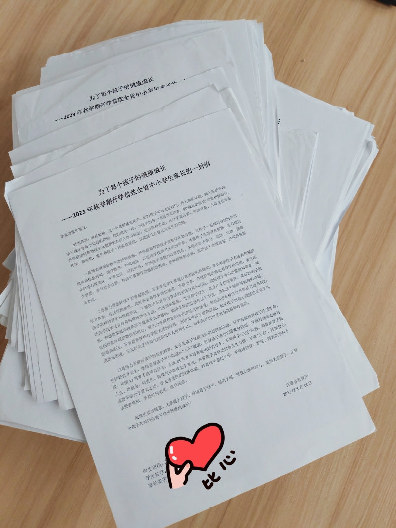 开学前,江师大附中将省教育厅《2023年秋季学期开学前致全省中小学生家长的一封信》,以校园官微和纸质的形式,推送给每一位学生和家长,清楚明析的拉近了家校共育,为了每个孩子的健康成长,努力调整好孩子的开学状态、努力营造好孩子的家庭氛围,努力开展好孩子的安全教育。