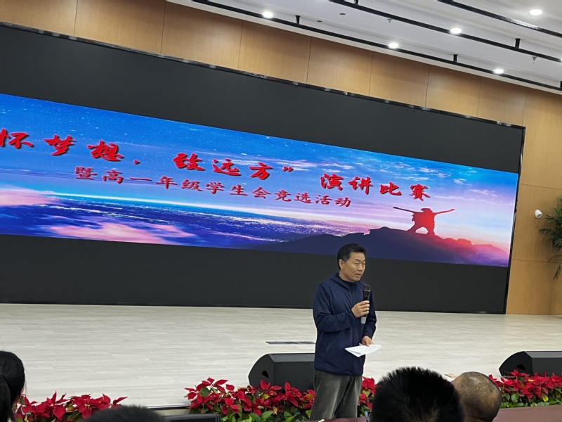 最后,石鑫校长对此次活动进行了点评。他首先表扬了高一学生能站上舞台演讲的勇气,对同学们的表现表示肯定,对场下响起的阵阵鼓励的掌声表示感动。他说,这样的活动为学生提供了一个展示自己,增强信心和自我认识的平台。通过参与这样的活动,学生们也能够学习到如何表达自己、如何与他人沟通和合作的重要技能。这些都是他们未来成功的重要因素。
