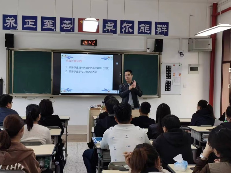 班主任首先向家长介绍班级情况,展示学生在校优异表现,并结合最近一次月考,从各个层面和角度表扬了学生在校学习生活情况。