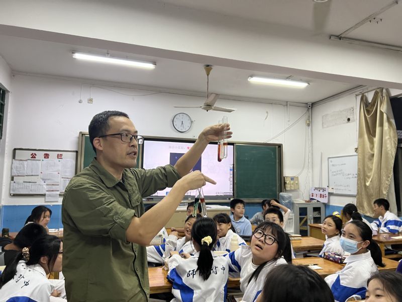 七4班高溪遥爸爸通过列举生活中衣、食、住、行等方面的例子,打破了一些常见的错误认知,如:真正能够阻隔紫外线的防晒衣面料价格昂贵,不同的食物同食是否对人体有害要考虑剂量因素,使用乙醇汽油可以降低化石燃料对空气的污染,氢气是更加清洁、高能的燃料……高溪遥爸爸给同学们直观展示了氧化铁溶液与不同物质反应的实验,同学们纷纷凑到讲台前观看,对化学充满了极大的热情与好奇。