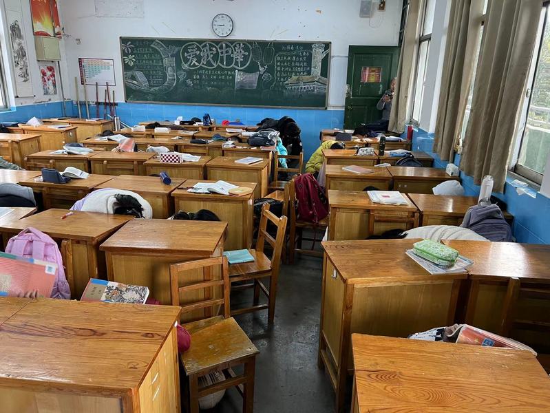 40秒“险情”过后,同学们快速离开座位,用一本厚书挡住头顶,在老师的组织下,沿着预定路线和楼梯,有序、快速跑到校园中的安全地带。