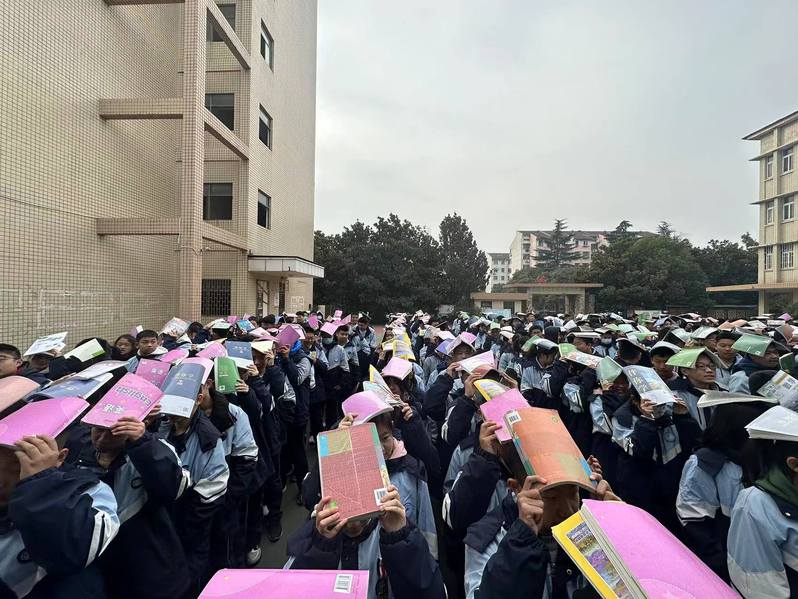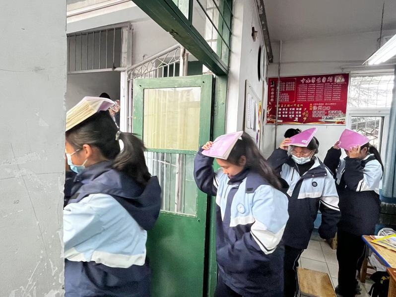 40秒“险情”过后,同学们快速离开座位,用一本厚书挡住头顶,在老师的组织下,沿着预定路线和楼梯,有序、快速跑到校园中的安全地带。