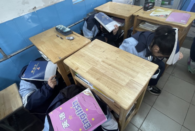 天高风清,冬日肃杀,上午8点45分,警报声响起。在初中部王永臻校长、张建军副校长的统一指挥下,全体同学在老师们的指导下,迅速躲到课桌下进行紧急避险。