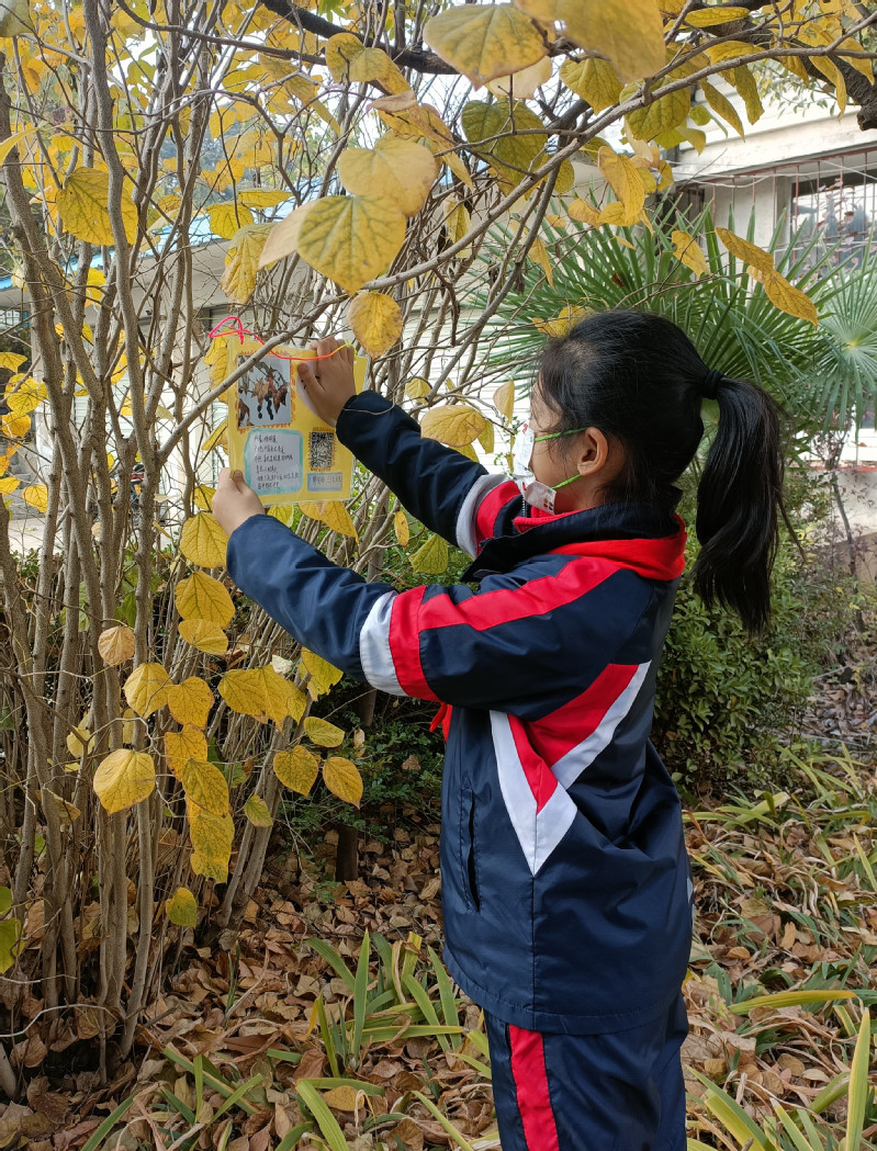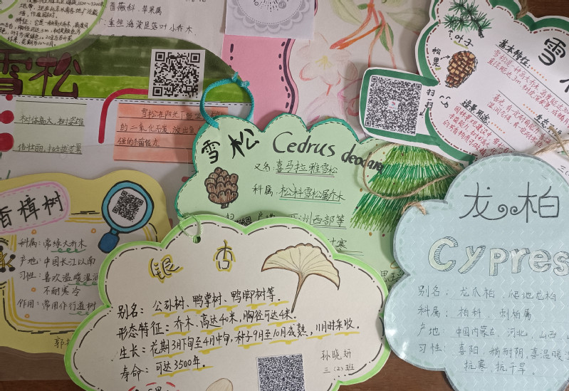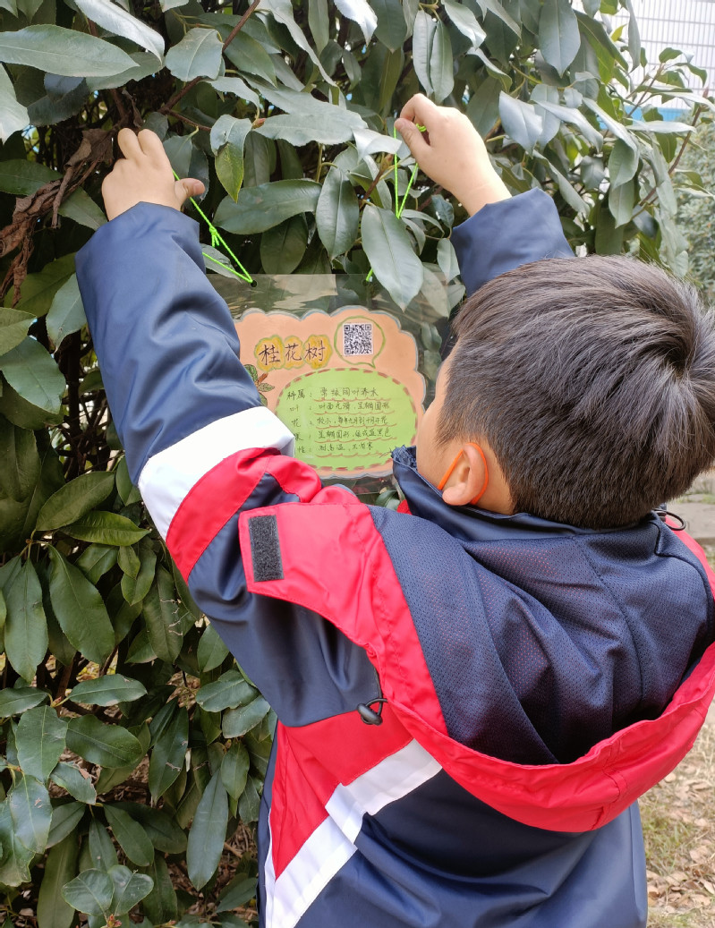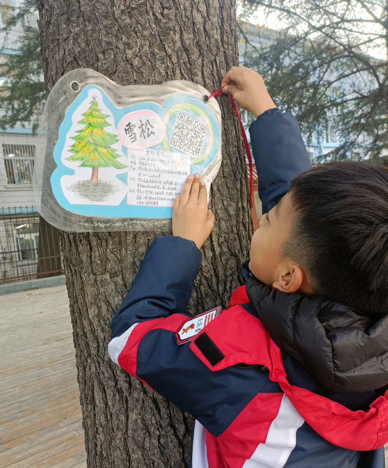 美术课上,孩子们利用捡来的树叶,准备好的彩色卡纸给小树制作名片。在计算机课上,孩子们跟着计算机老师学会了制作二维码,只要扫描二维码就能看到孩子们录制的介绍校园树木的视频,视频中每个孩子的演说都是那么娓娓动听,绘声绘色。