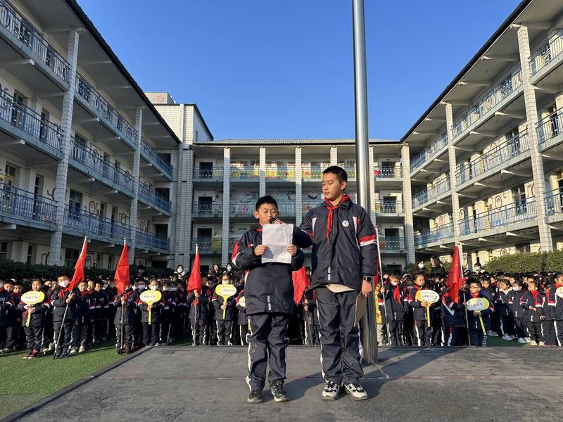 五1中队刘子誉同学迎着飘扬的五星红旗向全校师生发出倡议:作为新时代的少先队员,我们要知法懂法,宪法权威不可侵犯,法律所走的每一步都闪爆着法理的光辉,让我们追随着这崇高的敬仰,无畏地向未来奋进。