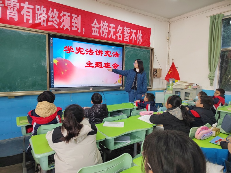 在主题班会课上,班主任老师再次与学生们共同学习宪法知识,向小学生普及宪法的地位、内容和作用等基础知识,让学生们了解宪法的重要性。