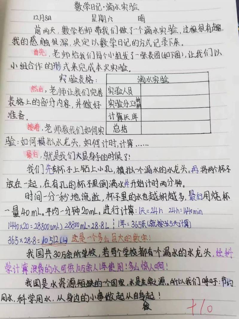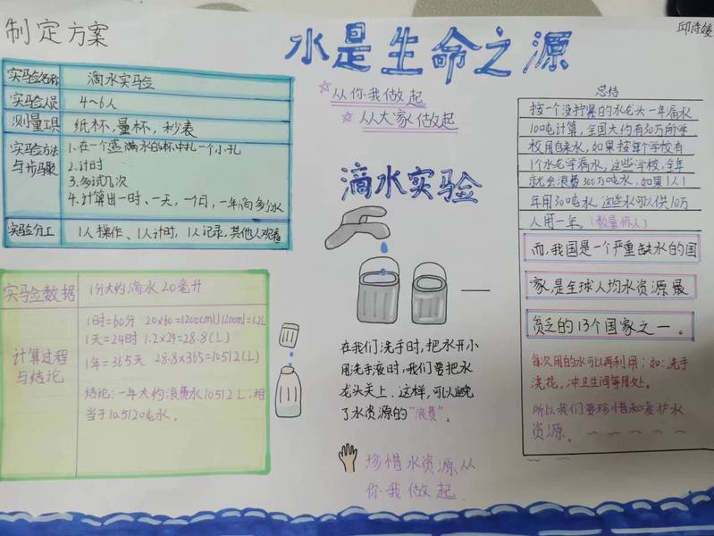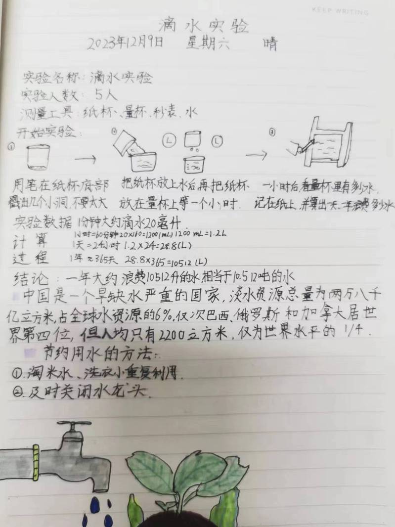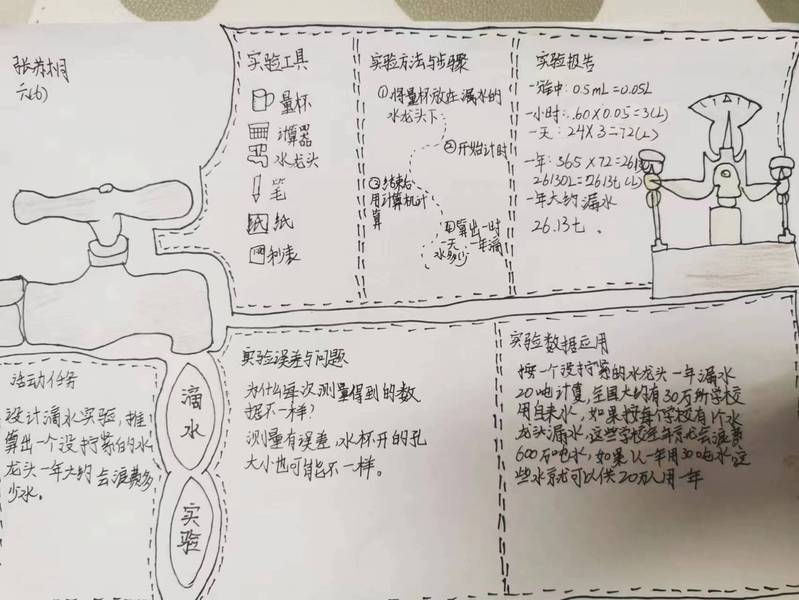 一个没有拧紧的水龙头一年会浪费很多水,多个没有拧紧的水龙头浪费的水会更多,我们一定要养成随手拧紧水龙头的习惯,提高节水意识,珍惜水资源。学生们将本次实验活动经历写成了数学日记或手抄小报,表达自己的收获。