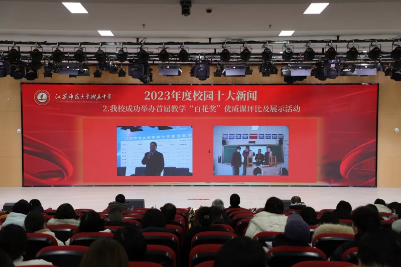 会议现场播放了2023年度校园十大新闻,回顾了一年来记录着学校发展和变化的重要事件。每一条新闻,都展现了学校的进步发展和变化,也记录着老师们努力的身影和收获的喜悦。