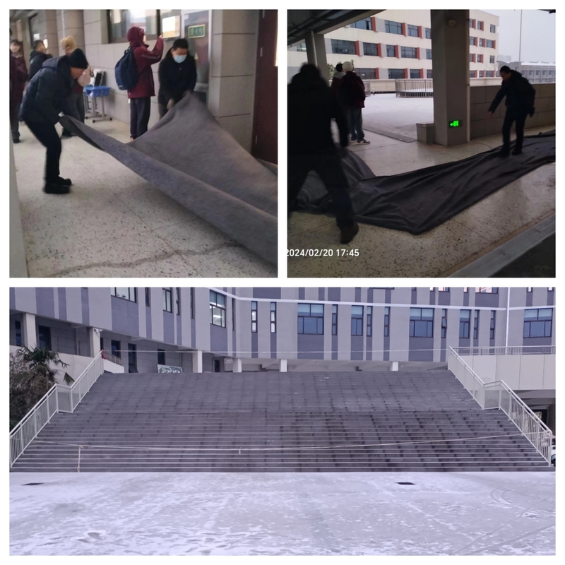 20号下午起,我市先后出现雨、冻雨、冰粒、大雪等复杂恶劣天气,道路结冰异常严重,给出行带来极大的安全隐患。为减少低温雨雪冰冻等极端恶劣天气对教职工、学生出入校的不利影响,学校领导迅速启动恶劣天气应急预案,学校领导、后勤总务处、安保处、德育处等立即部署落实防范应对措施,及时清除积雪、设置警示提醒标识、摆设围栏、铺设防滑地毯等,同时对学生及家长进行安全教育,确保师生出入安全。