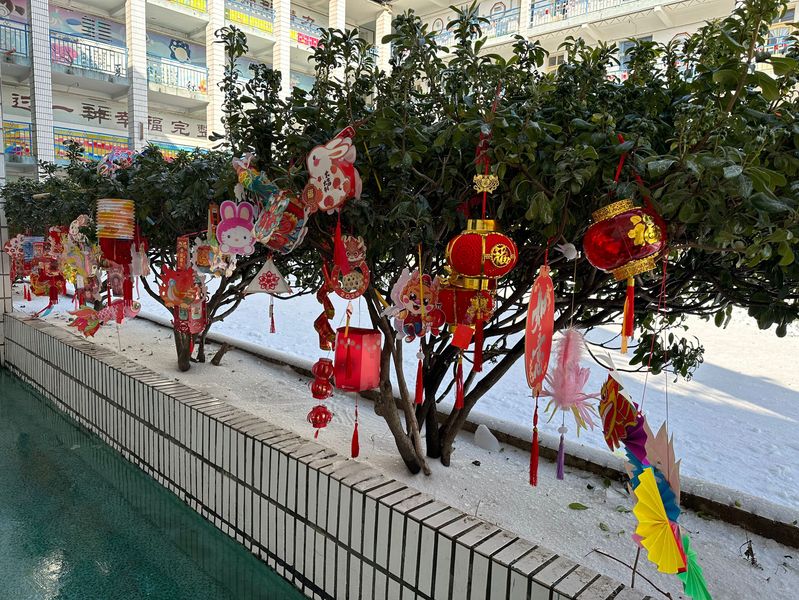 除了缤纷的灯笼,学校的布置中还有一个令人瞩目的传统手工作品展示区。这些手工作品,如对联、红包、灯笼、剪纸等,宛如璀璨的明珠,吸引着无数师生的目光。师生们驻足欣赏,赞叹不已,纷纷与这些富有创意的作品合影留念。
