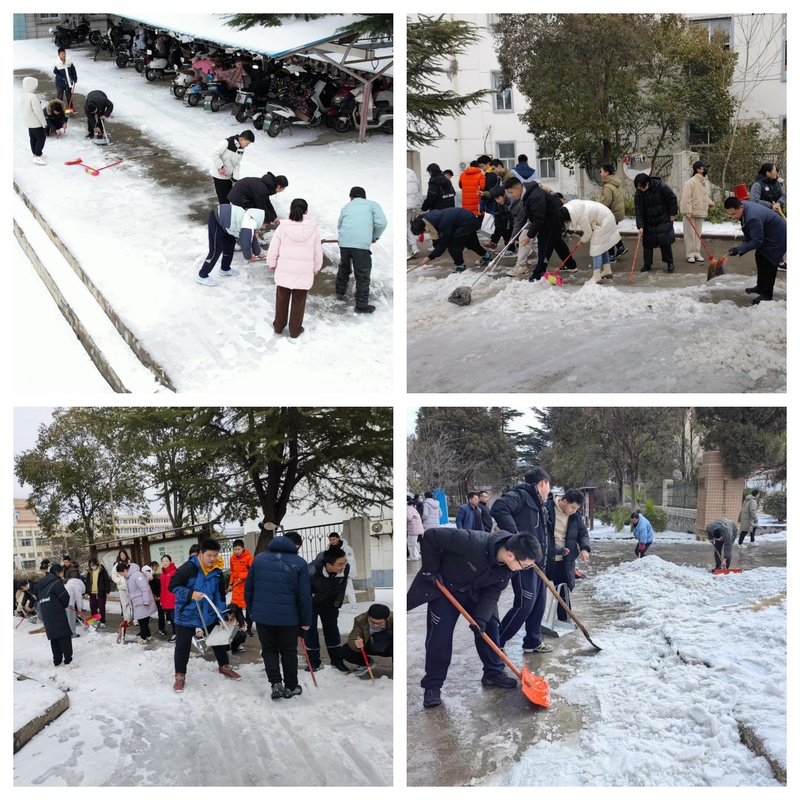 连日的冻雨、积雪、降温导致路面结冰严重,为保障今日返校的小学部、初中部师生出行安全,学校领导、小学部和初中部的干部教师凌晨起就启动了破冰开路行动。由于气温低,路面冰冻坚硬,给清扫工作带来极大困难。大家或铲、或推,或砸、或扫齐发力;锄头、铁锹、推雪铲齐上阵,在学生到校之前将校园主要道路冰雪全部清扫干净。