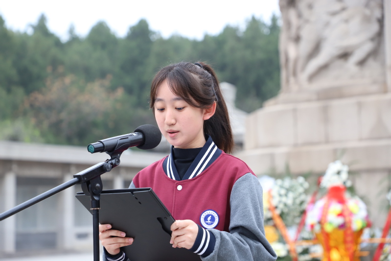 陵园内翠柏环绕,庄严肃穆,烈士纪念塔巍然伫立其中。学子们肃立于碑前,全体默哀三分钟。其后,两名学生代表上前敬献花圈,教师代表沙梦在纪念碑下发言,她说:“年年祭扫先人墓,处处犹存长者风。春风已解千层雪,后辈难忘先烈恩。我们要无愧伟大的时代,奋然前行,实现’中国梦‘,实现中华民族的伟大复兴”。