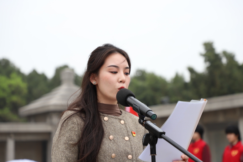 陵园内翠柏环绕,庄严肃穆,烈士纪念塔巍然伫立其中。学子们肃立于碑前,全体默哀三分钟。其后,两名学生代表上前敬献花圈,教师代表沙梦在纪念碑下发言,她说:“年年祭扫先人墓,处处犹存长者风。春风已解千层雪,后辈难忘先烈恩。我们要无愧伟大的时代,奋然前行,实现’中国梦‘,实现中华民族的伟大复兴”。