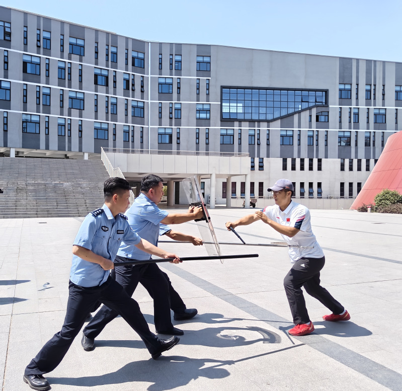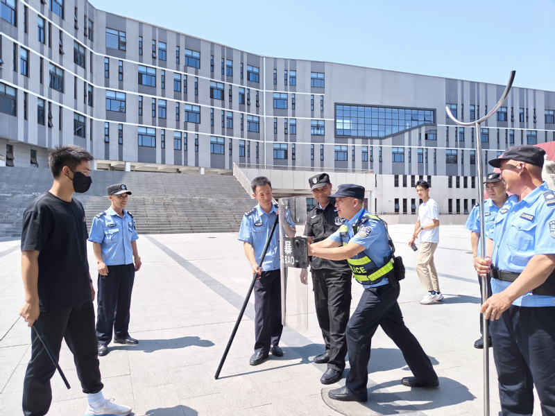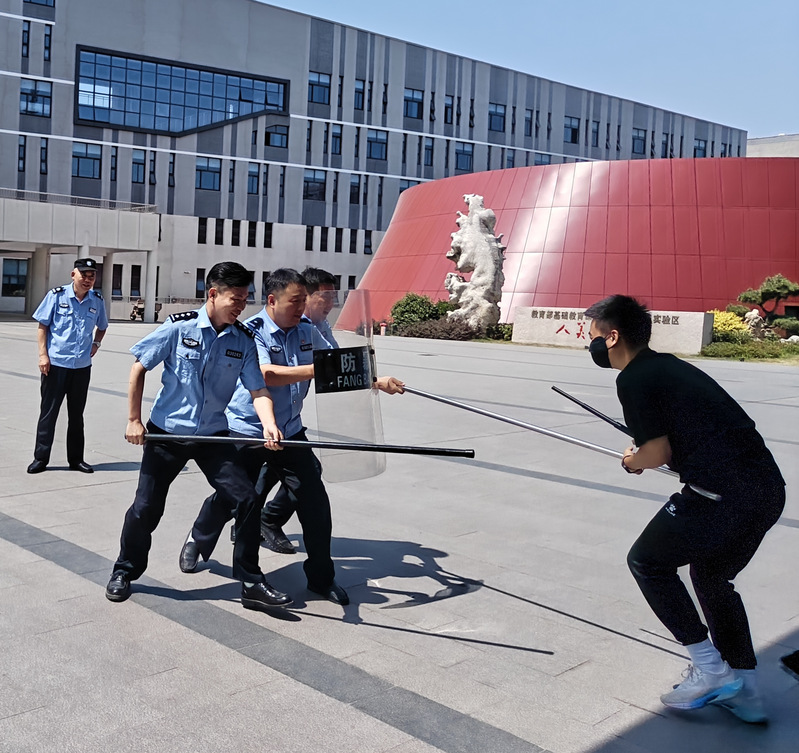 演练前,学校成立反恐防暴应急小组,制定演练方案。翟山派出所指导员邵梅生同志讲解盾牌、钢叉、长棍等安防器械的使用方式,并现场进行实战演练讲解。面对歹徒,两人组、三人组之间协同配合,在有效控制歹徒活动区域的同时,最大限度确保自身安全。