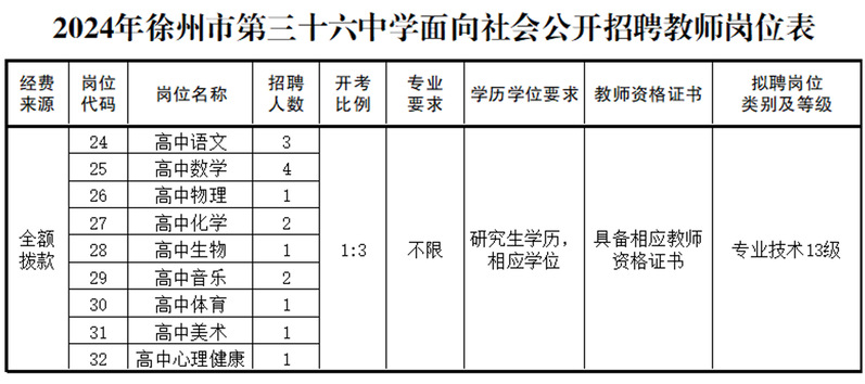 http://hrss.xz.gov.cn )、徐州市教育局网站(http://jyj.xz.gov.cn )、徐州市第三十六中学(江苏师范大学附属中学)网站(http://sdfz.jsnu.edu.cn)发布,具体的岗位名称、招聘人数、资格条件等详见下表。
