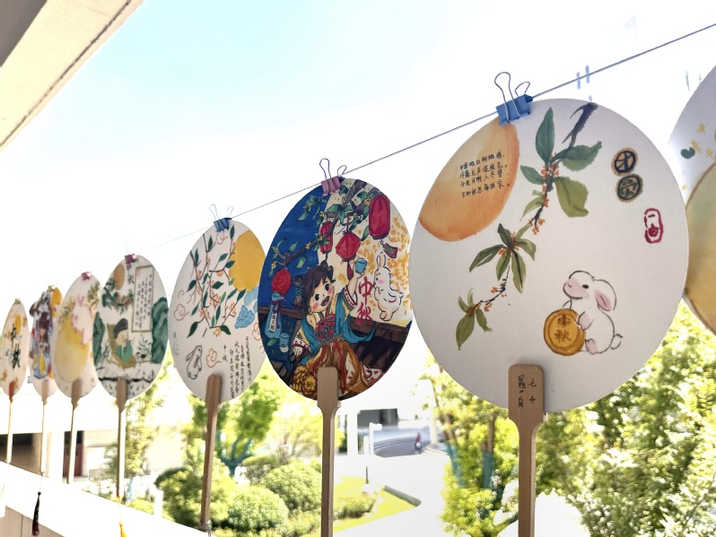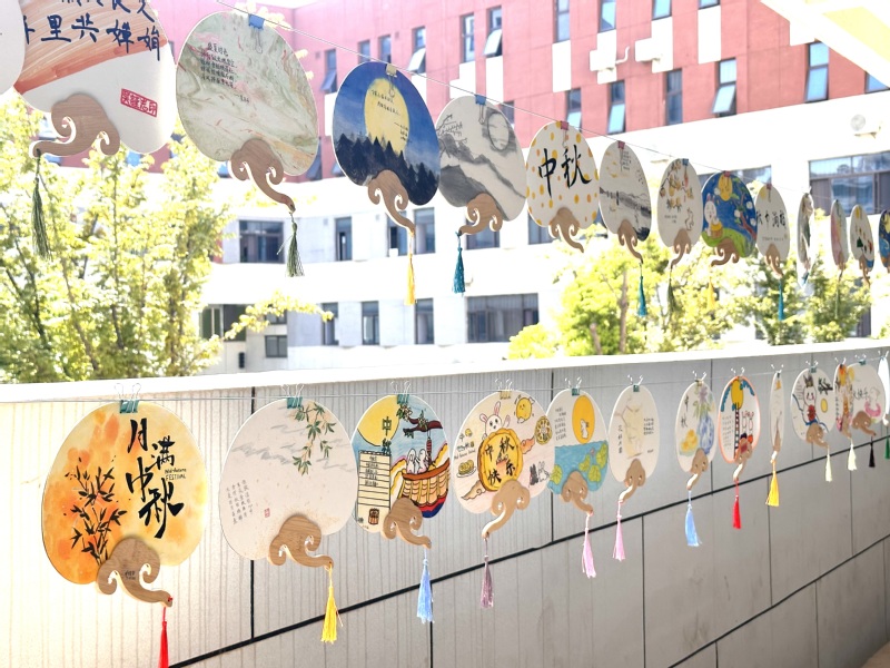 吟诵着古人对明月的赞美与思念,让我们仿佛穿越时空,与千年前的诗人共赏同一轮明月。七年级语文组以“中秋月圆人团圆”为主题,带领学生们完成团扇制作,扇面绘图后在旁边题上小记、小诗、感想等。同学们有的以望月为主题,绘出皎洁明月与飘渺云海;有的以中秋团圆之景,讲述阖家欢聚的温暖;还有的融入了兔子、桂花等传统元素,寓意吉祥与幸福。学生们将精美的手工作品挂在展示栏上、走廊中,每一把团扇都承载着他们对中秋佳节的独特理解和美好祝愿,引来许多同学与老师的驻足观赏。