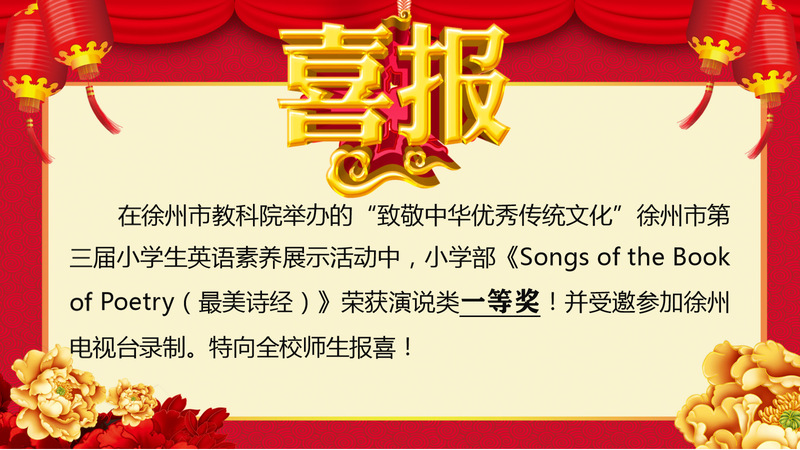 2024年11月21日,在徐州市第三届小学生英语素养展示活动中,徐州市第三十六中学附属小学选送的英语演说类节目《Songs of the Book of Poetry》凭借其精彩的表演和深刻的内涵,荣获一等奖。11月29日,作为优秀节目代表,参赛师生受邀至徐州电视台进行节目录制。